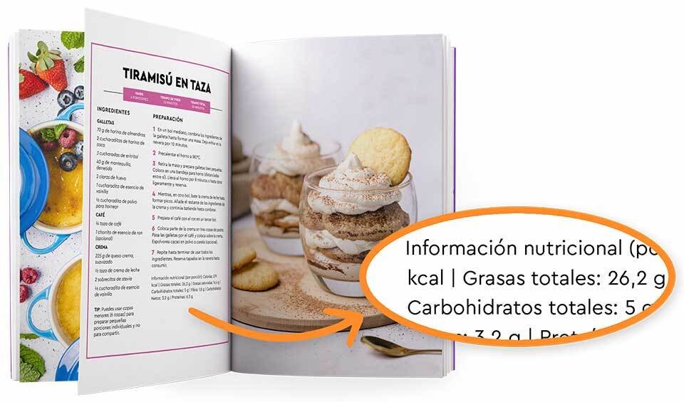 Todos los macros de las recetas ya están calculados. Así que sabrás la cantidad de proteínas, grasas y carbohidratos que consumes en cada porción.